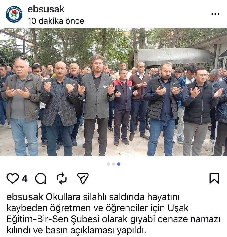 Uşak’ta sendika camiasında şaşkınlık yaratan bir olay yaşandı. Aynı saatte Türk Eğitim Sen’in düzenlediği gıyabi cenaze namazına katılmayan Türk Sağlık Sen Uşak Şube Başkanı Mehmet Özkuk, rakip sendika Eğitim Bir Sen’in gıyabi cenaze namazına katıldı.