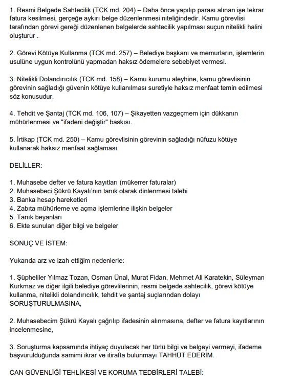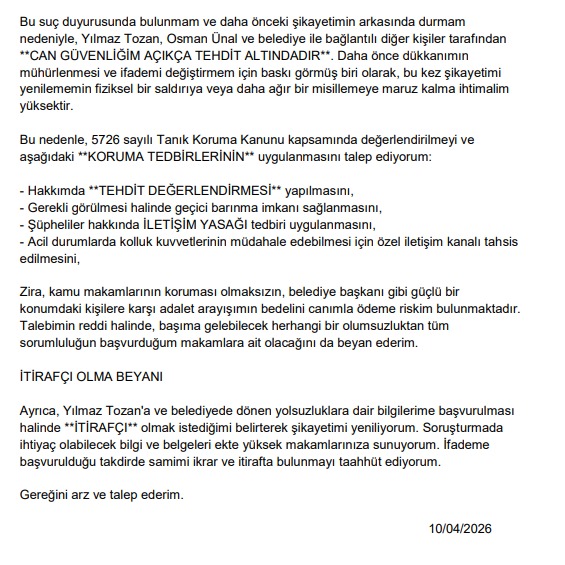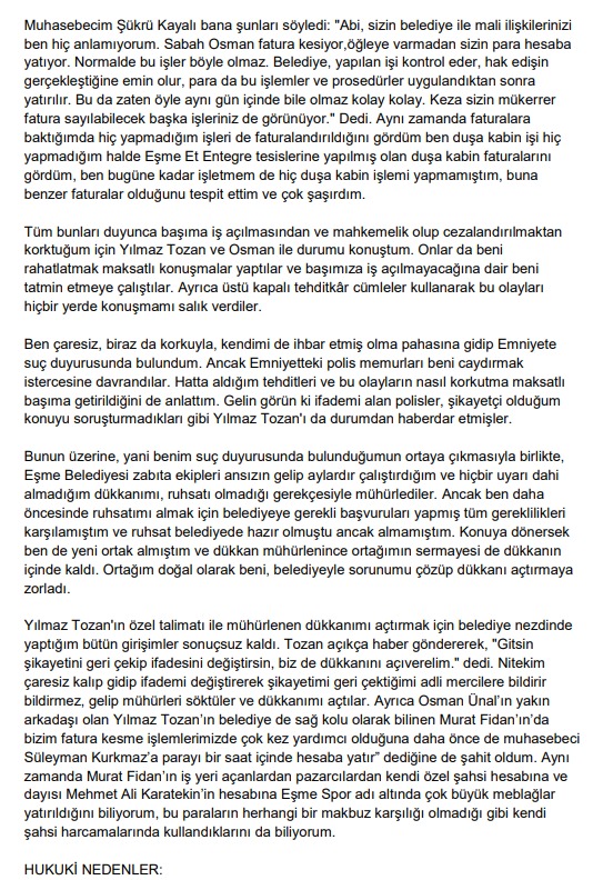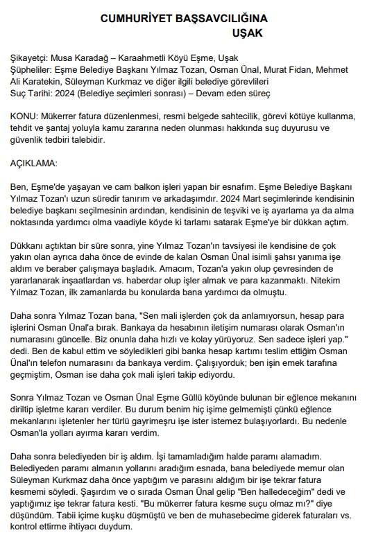 Tabii durumu fark edince Tozan ve diğer ortağı Osman’a hesap sormak istiyor. Ama kaymakam ile de emniyet ile de arası çok iyi olan Tozan umursamaz davranınca Musa Karadağ gidip emniyete suç duyurusunda bulunuyor. Lakin emniyet konuyu kapatmaya dönük zamana yayıyor. Bu sırada geliyor Eşme Belediyesi zabıtaları, işyerini mühürlüyor ve mührü açmak için şikayeti geri çekmesini istiyor. Günler süren sürtüşme sonrası, yanına aldığı yeni ortağının da baskısıyla ruhsatı alıp dükkanı açtırmak isteyen Musa, gidip suç duyurusunu Yılmaz Tozan ve avanesinin istediği şekilde ifadesini değiştirerek geri çekiyor. Şimdilerde Yılmaz Tozan'a güvenmenin bedelini ağır ödeyen arkadaşı Musa, ayrıca Tozan ve avanesinin gözü dönmüş gibi davranmaları sebebiyle korku ve panik içinde yaşıyor ve canının bile tehlikede olduğunu düşünüyor. Editörümüz Gazeteci Ramazan Yıldız'a beyanat veren Musa, geçtiğimiz cuma günü Uşak adliyesinde şikayette bulundu fakat Eşme’de yaşadığı olaylar neticesinde adalete de pek güvenemiyor. Bahse konu suç duyurusunu aşağıda paylaşacağız,İddialar hayli vahim. Bakalım adliye iddiaları inceleyip gereğini yapacak mı? Ama iddiaların savcılık ve mahkeme nezdinde ispat edilmesi halinde Yılmaz Tozan'ın akıbetinin de son kongre sürecine değin, ilk baştan beri beraber hareket ettiği akıl danesi Özkan Yalım'ın akıbetine benzeyeceğine Eşme’liler şimdiden kesin gözüyle bakıyor.